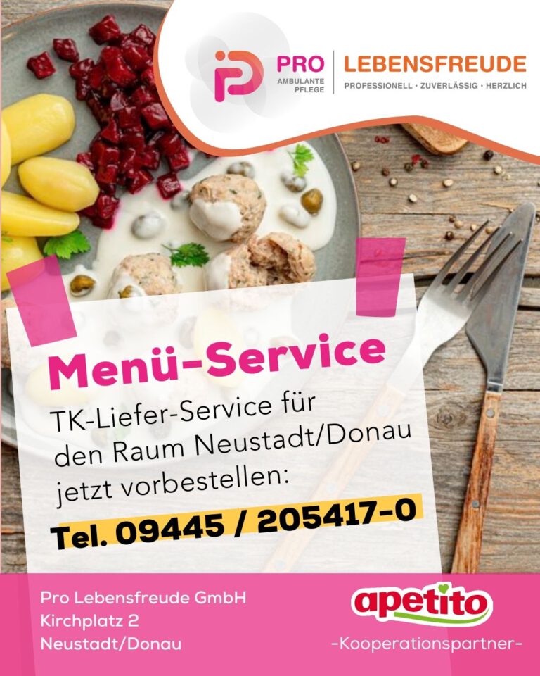 Wer eine gesunde Möglichkeit zur Versorgung mit abwechslungsreichen Mahlzeiten sucht, kann sein Wunschessen bei unserem neuen TK-Menü-Service in Neustadt bestellen. Im Raum Großmehring fragen wir gerade ab, wer Interesse hat. Der Menü-Service ist auch eine tolle Möglichkeit um Angehörige während der Urlaubszeiten zu versorgen oder einfach als Entlastung an Tagen, an denen sehr viel los ist.